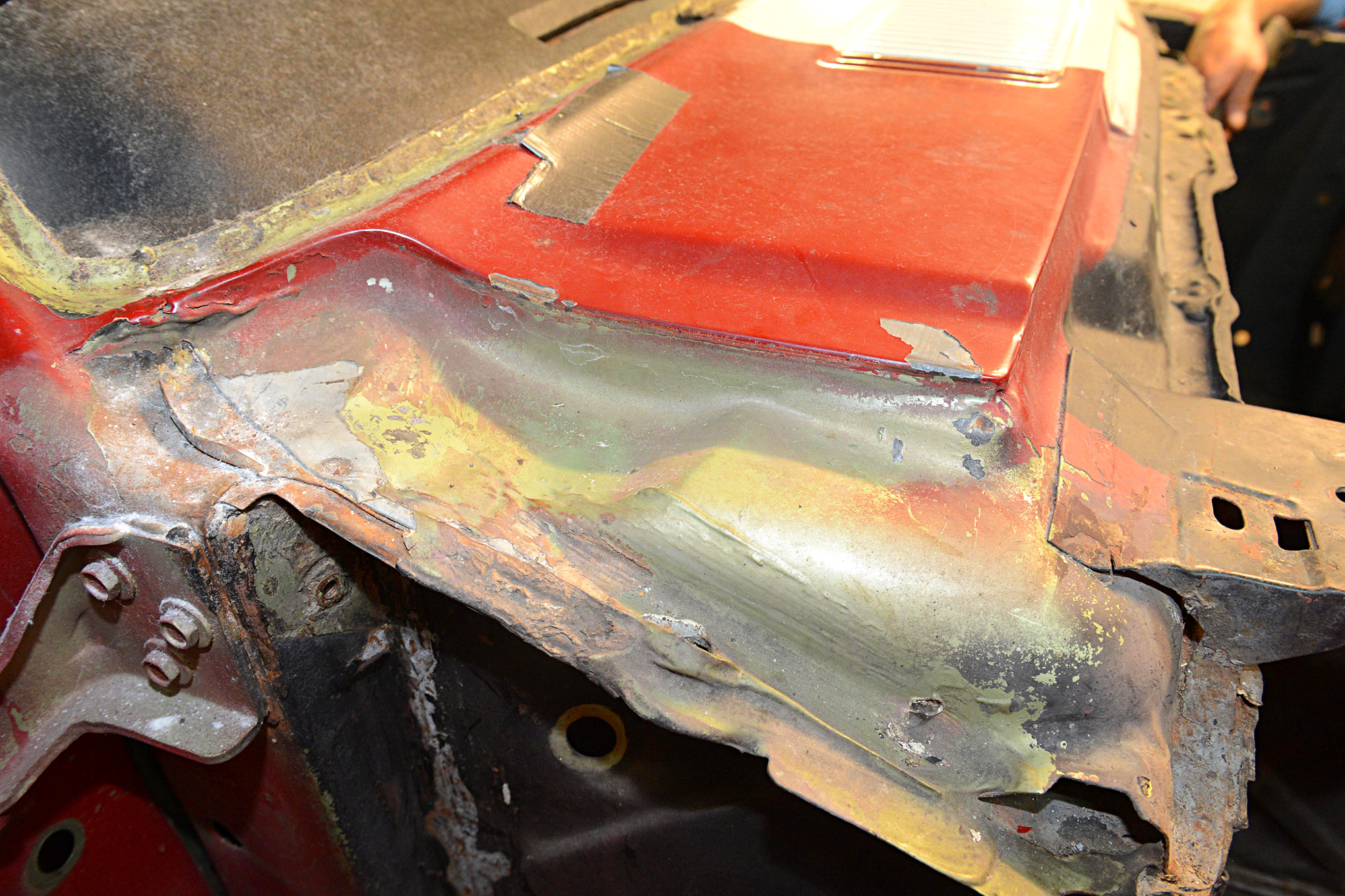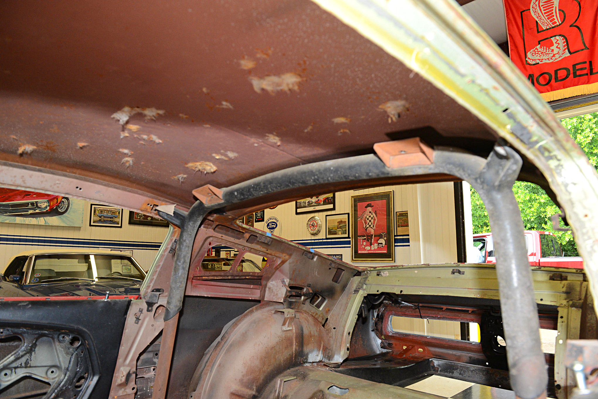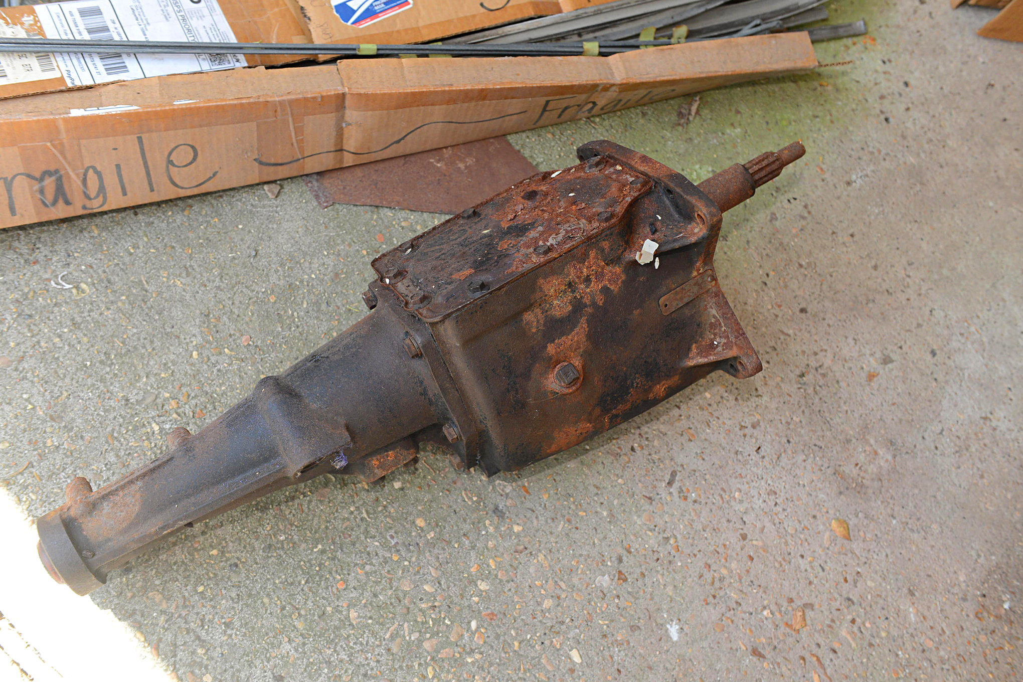 When Ken yelled, “Shane!” we knew he had found something big. “Is this the original transmission?” Ken asked. Shane moved away debris to get a closer look. He rubbed the pad on the side of the housing to discover the last six digits were a match to the Ford VIN. Yes, this was the original four-speed. A key missing part is the aluminum and wood steering wheel. Rosemary fears this piece might have been stolen.