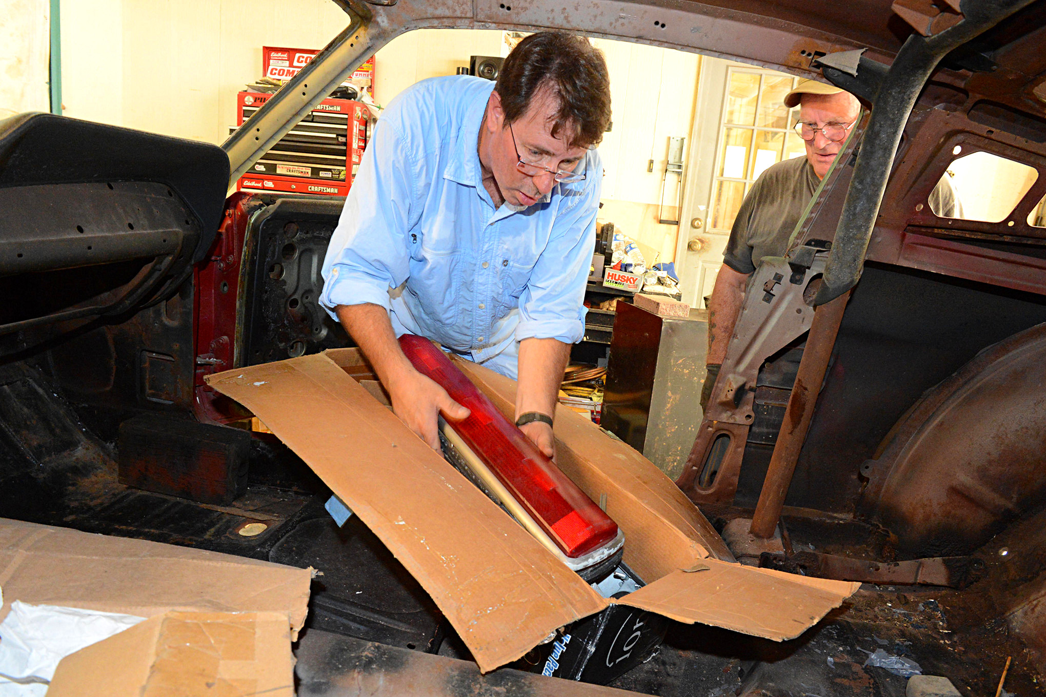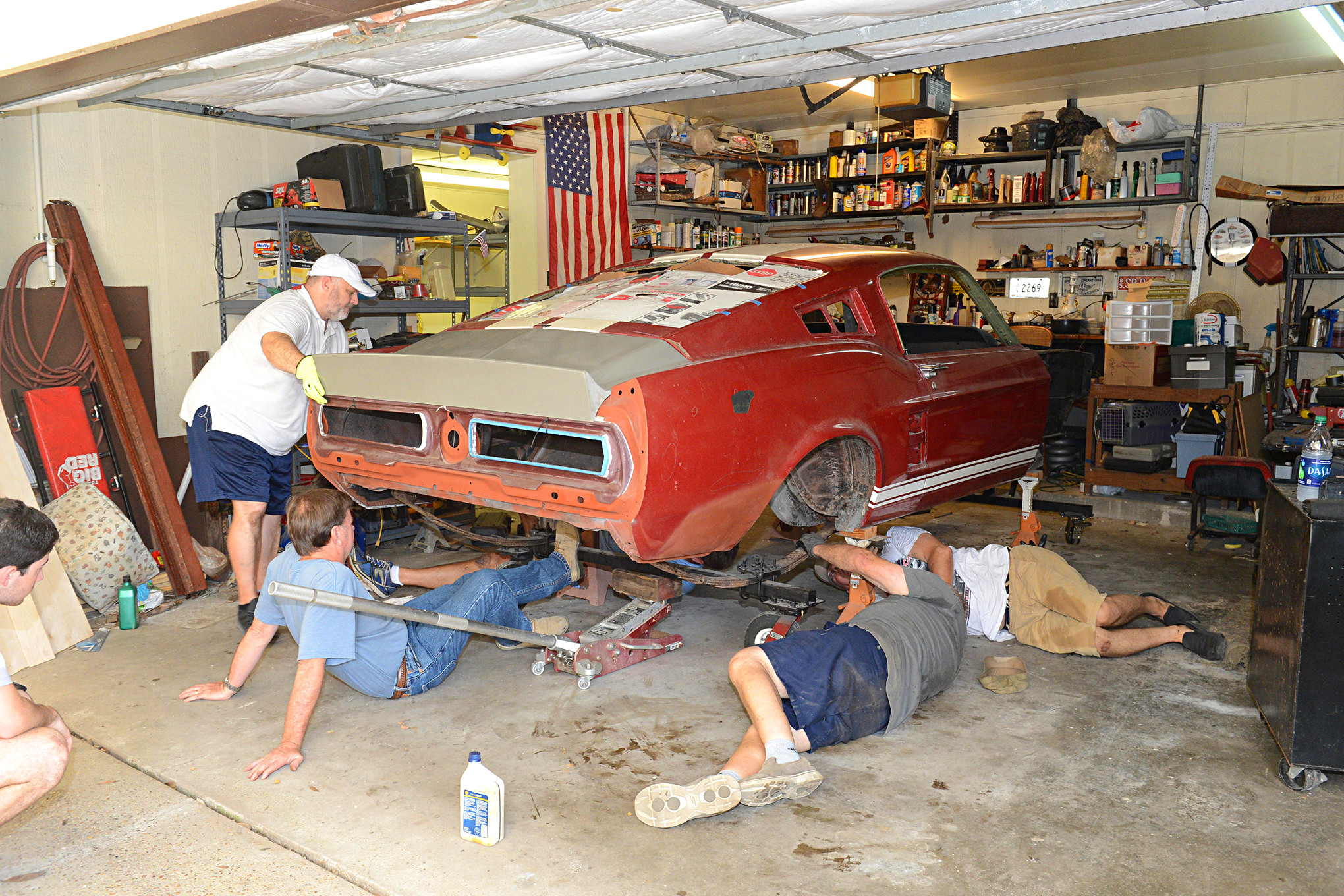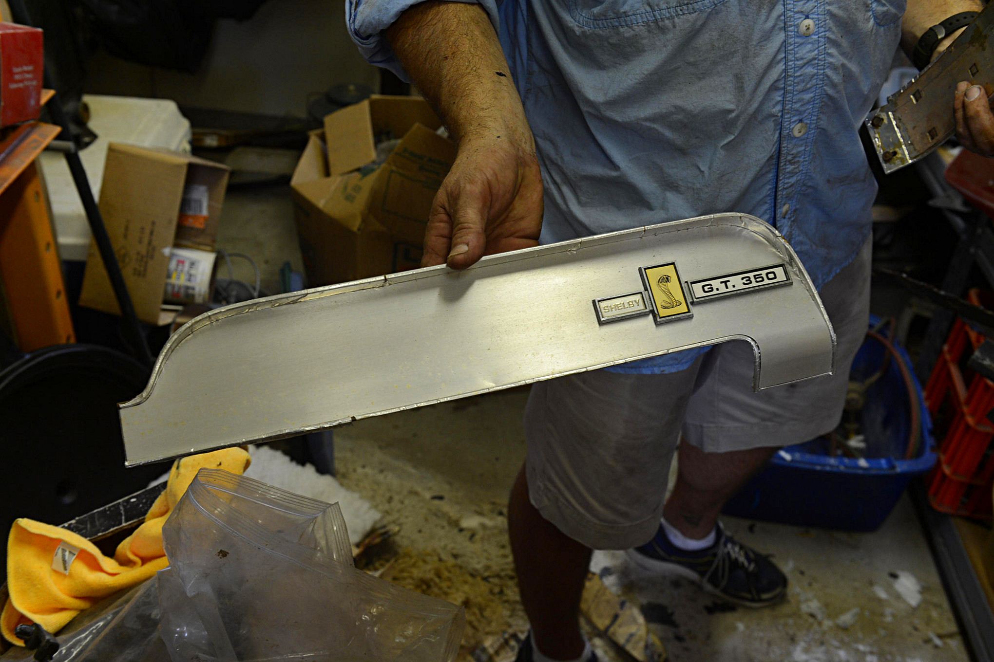 We walked around the car and into the adjacent room where the 289 Hi-Po was on an engine stand along with a ton of parts on shelves, including front and rear seats. Ken pointed to the rear axle on the floor. Dennis pulled off the mechanism for the fold-down rear seat off the garage wall; on another wall hung the Shelby’s decklid. Conrad carried it to the trailer.