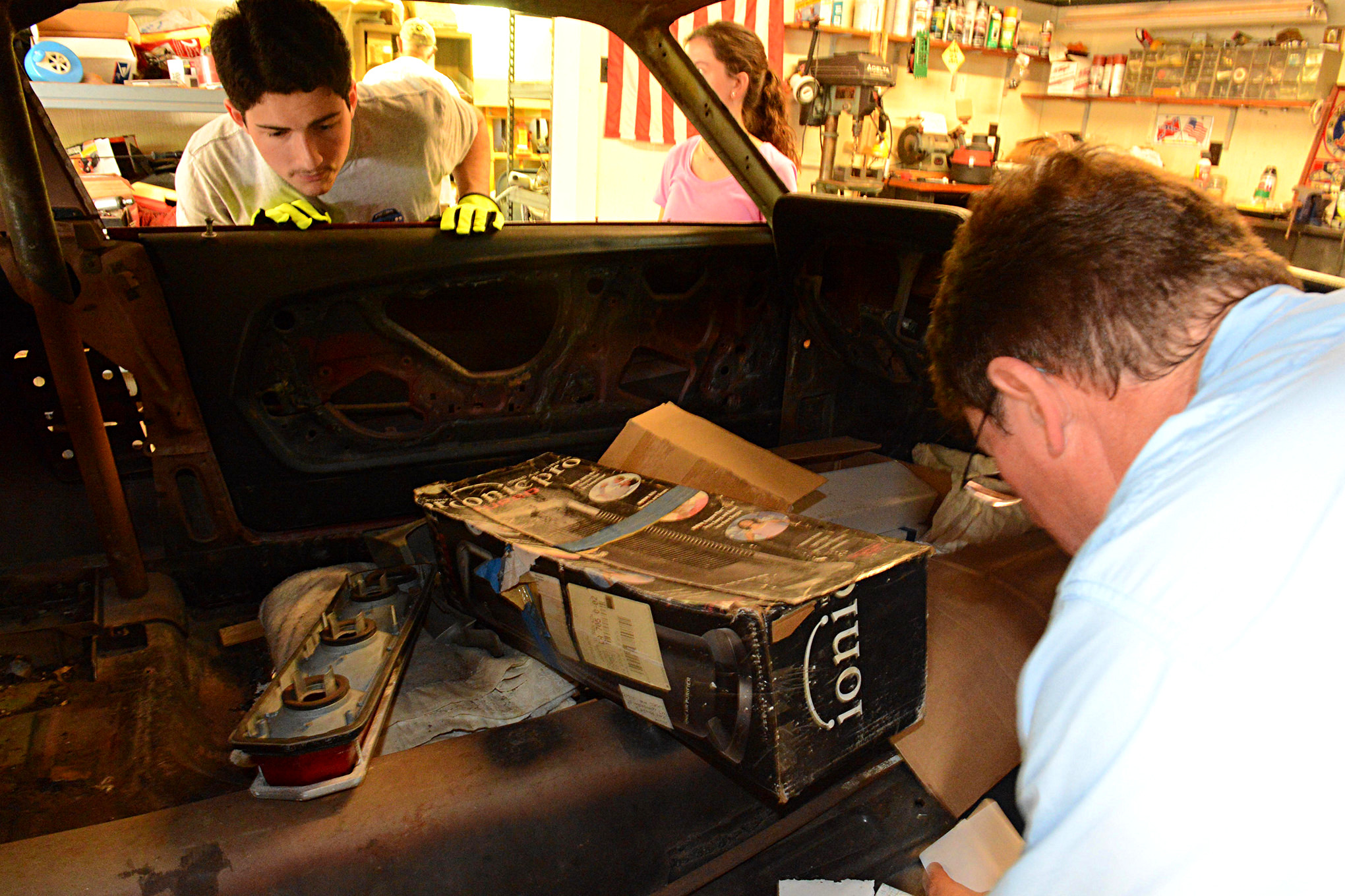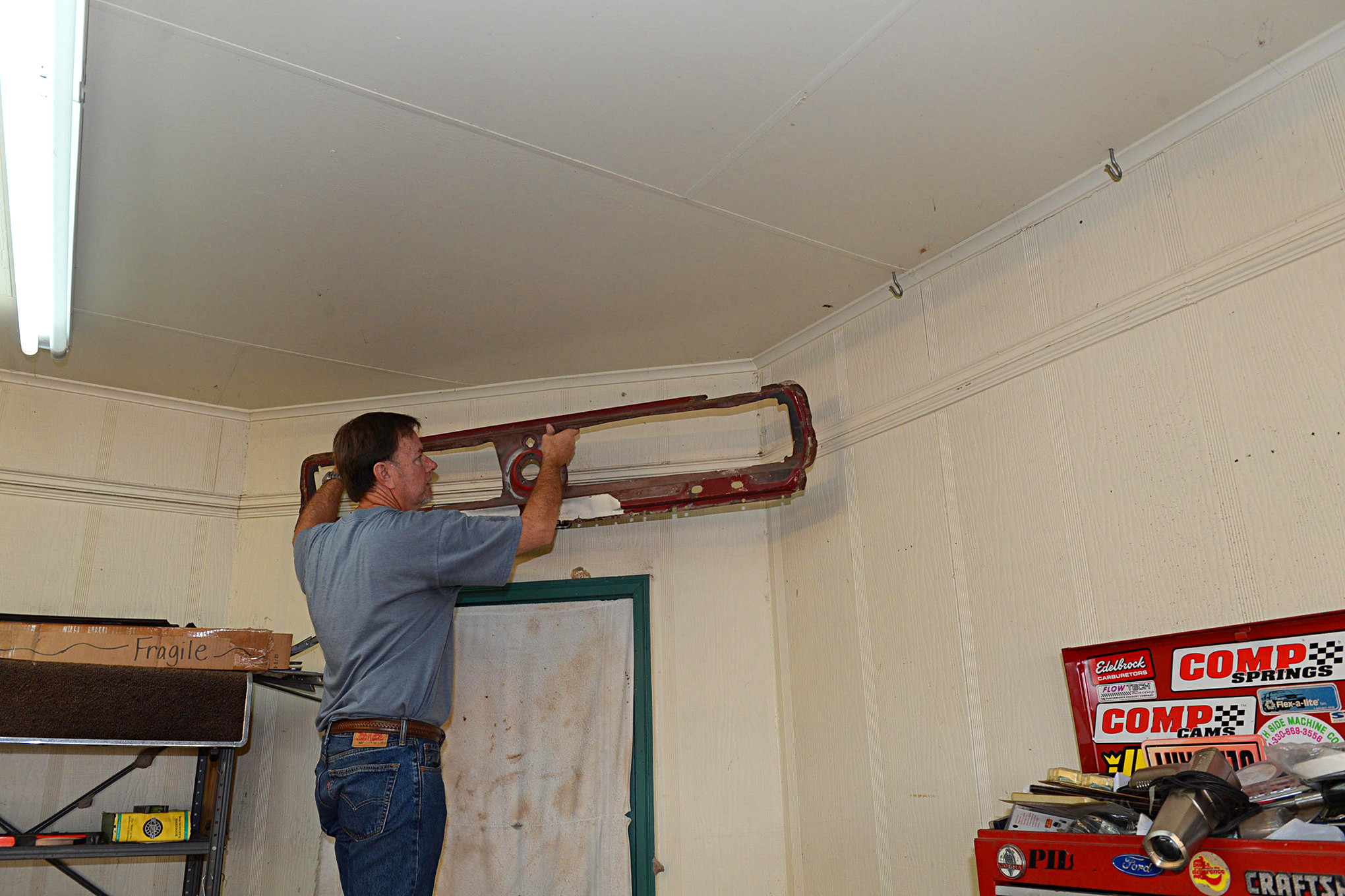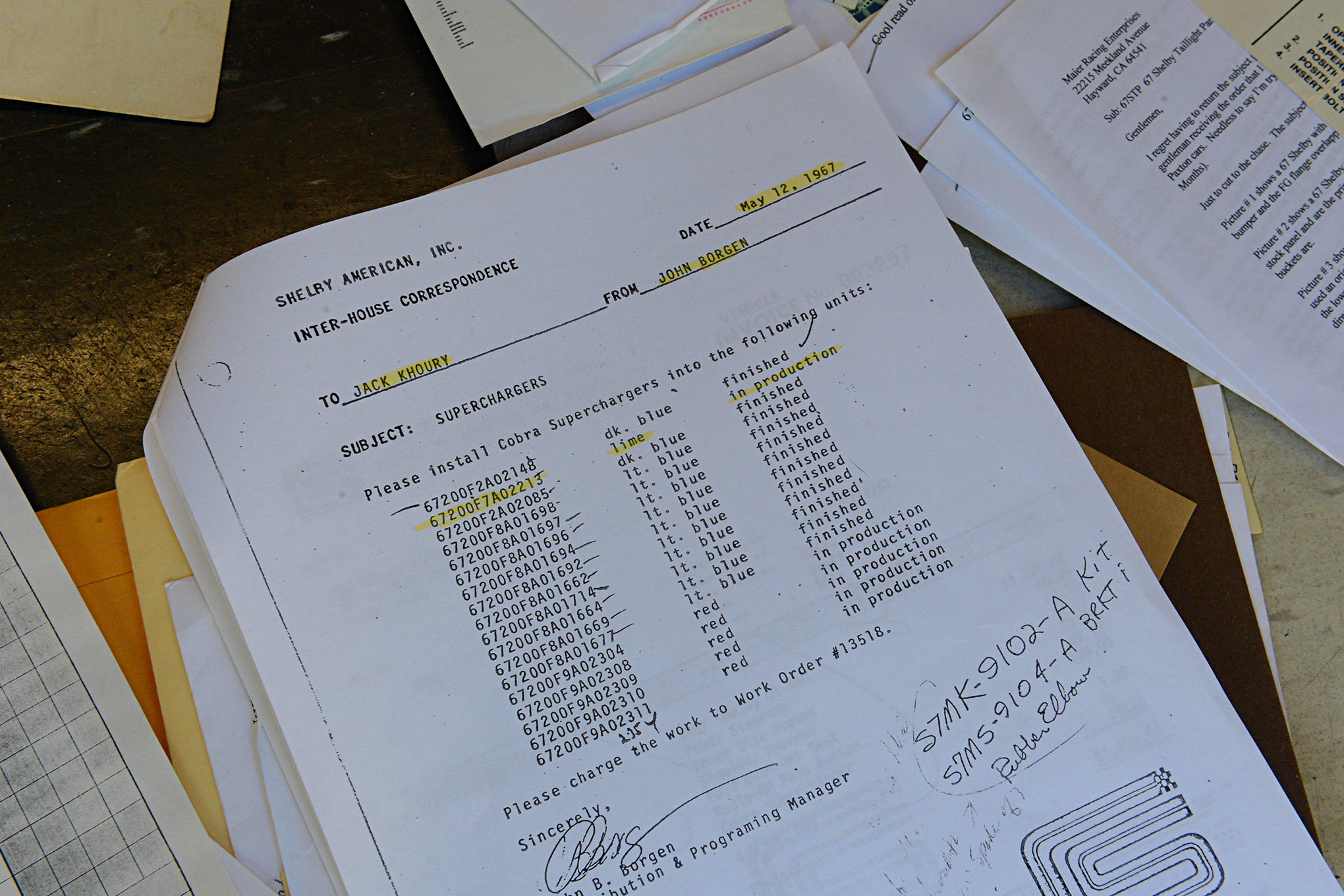 We walked around the car and into the adjacent room where the 289 Hi-Po was on an engine stand along with a ton of parts on shelves, including front and rear seats. Ken pointed to the rear axle on the floor. Dennis pulled off the mechanism for the fold-down rear seat off the garage wall; on another wall hung the Shelby’s decklid. Conrad carried it to the trailer.