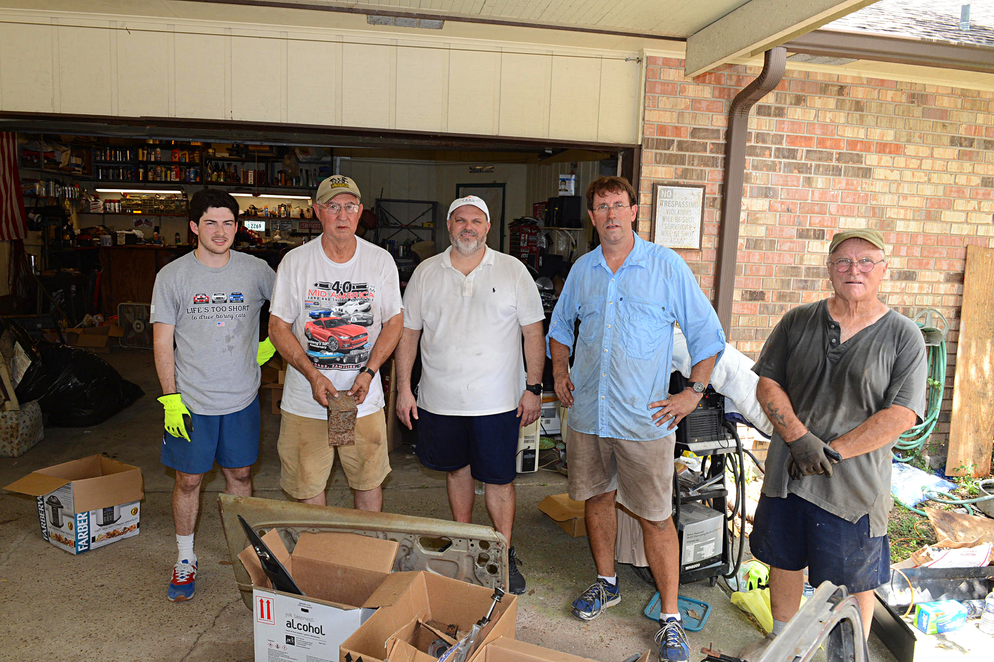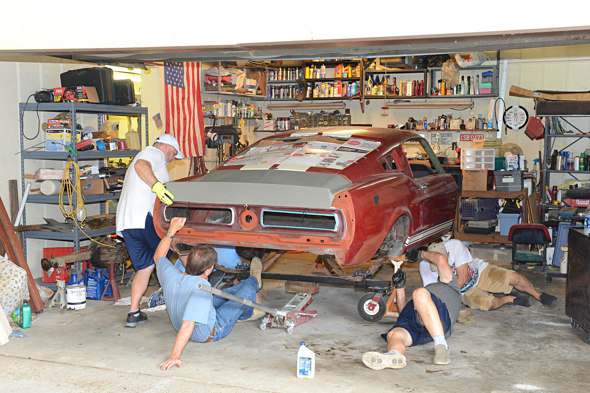 As we talked, Shane, Ken, Mike, and four more friends just arrived—Dennis Norman, Conrad Fry, his son Conrad IV, and his son’s girlfriend, Elizabeth Comeaux—and moved parts and debris from around the Shelby, which was completely covered. “He took it apart between 2003 and 2005, so it’s been sitting here for at least that long. You know how it is when they sit long enough. They become a table or a shelf,” Shane said.