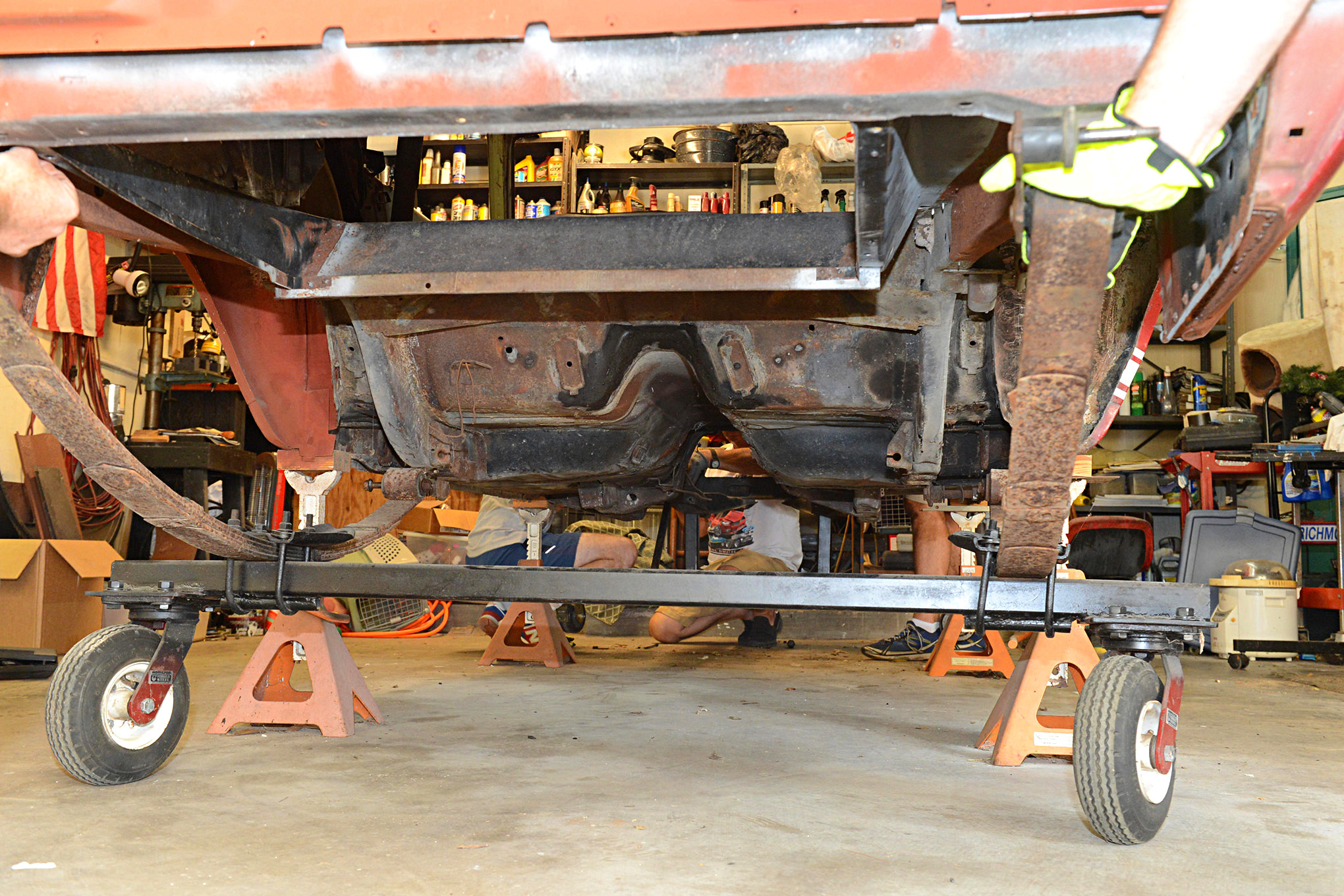 As they rolled back the covers on the ’67 Shelby body, Rosemary said this was the first time she had seen the Shelby in five years. She pointed out traces of the original Lime Gold paint on the body. Shane and his friends jacked up the body and attached Shane’s homemade body dolly on casters for easy transport to the enclosed trailer. With the body out of the main garage, we could remove the parts from the adjacent room, which included the original 289 High Performance engine on a stand.